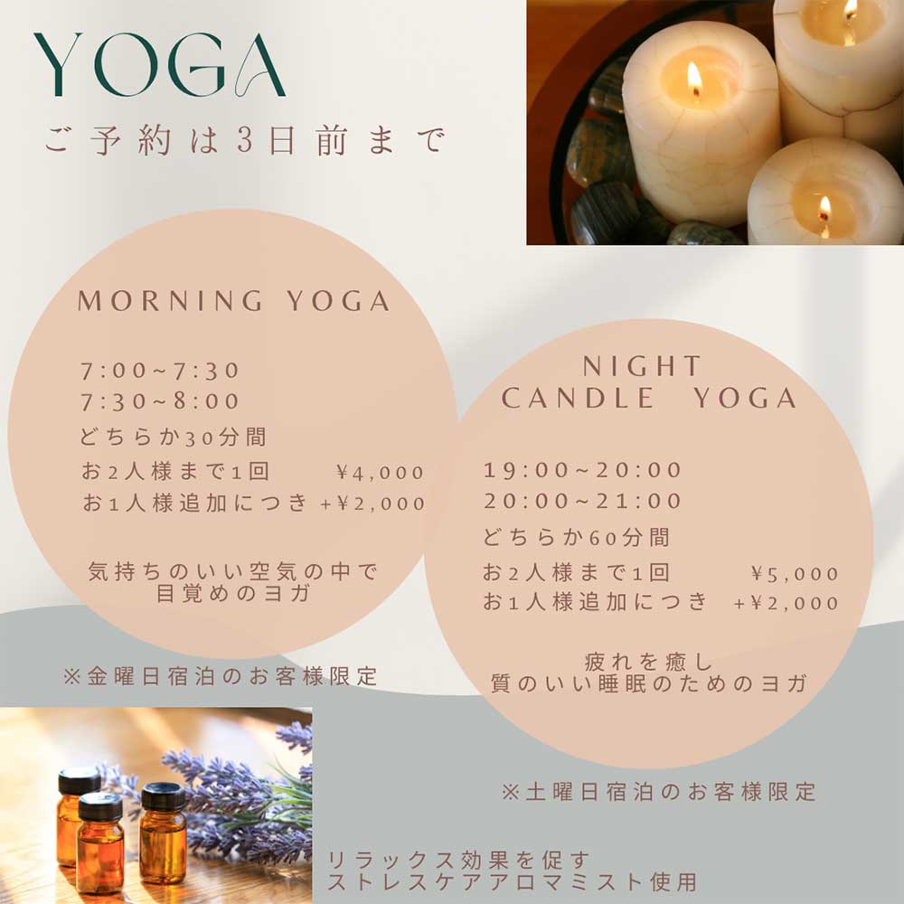 滞在中に体験できるヨガ体験では、穏やかな空間の中で、ゆったりとした時間をお過ごしいただけます。